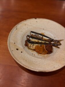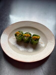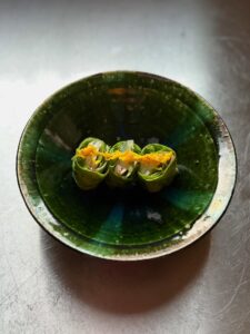 旬の白身魚の昆布〆をレタスで巻いた一品です。