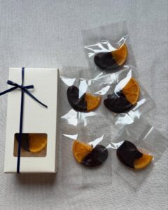 毎年大人気の太陽さんさんと浴びた無農薬オレンジをゆっくりゆっくり時間をかけて砂糖を煮含ませてオーガニッククーベルチュールチョコをかけたオランジェット。ホール3枚入り